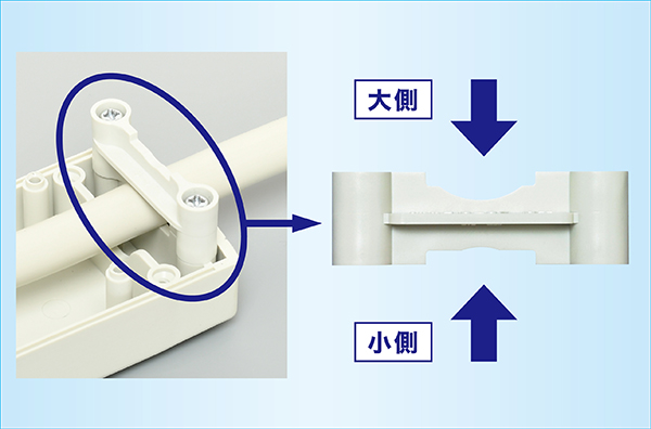グリップは上下の形状が異なっており、電線の種類・サイズによって使い分けて取り付けることができる仕様となっています。