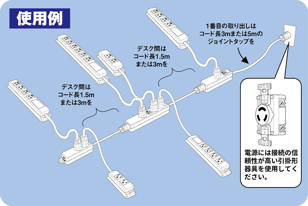 接地形2P 15A 125V | OAジョイントタップ 抜止形4ヶ口 コード3M 引掛形プラグ | 白色 | |