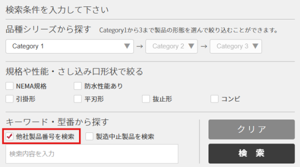 1、「他社製品番号を検索」にチェックを入れます。