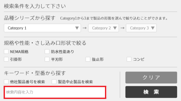 検索ボックス上部の「検索条件」から、種別や定格などの条件を指定することで、該当する製品を絞り込んでお探しいただくことが可能です。