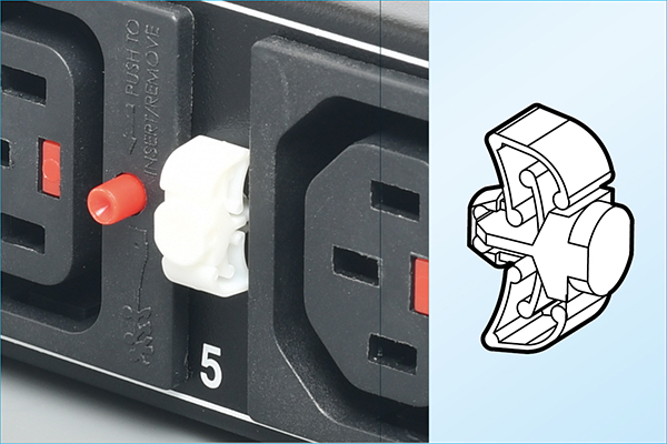 IEC C13のさし込み口(ソケット)に、IEC C14プラグの不意な脱落を防ぐ抜け止めロック機能を搭載。オプション品を使わずに既存のプラグをそのままさし込むだけでロックすることができるので、この1台で抜け防止対策を可能にします。