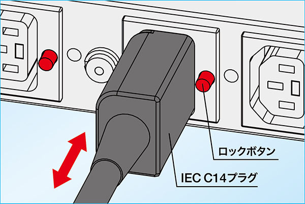IEC C14プラグを抜き差しする際には、さし込み口近傍にある赤いロックボタンを押しながら行ってください。